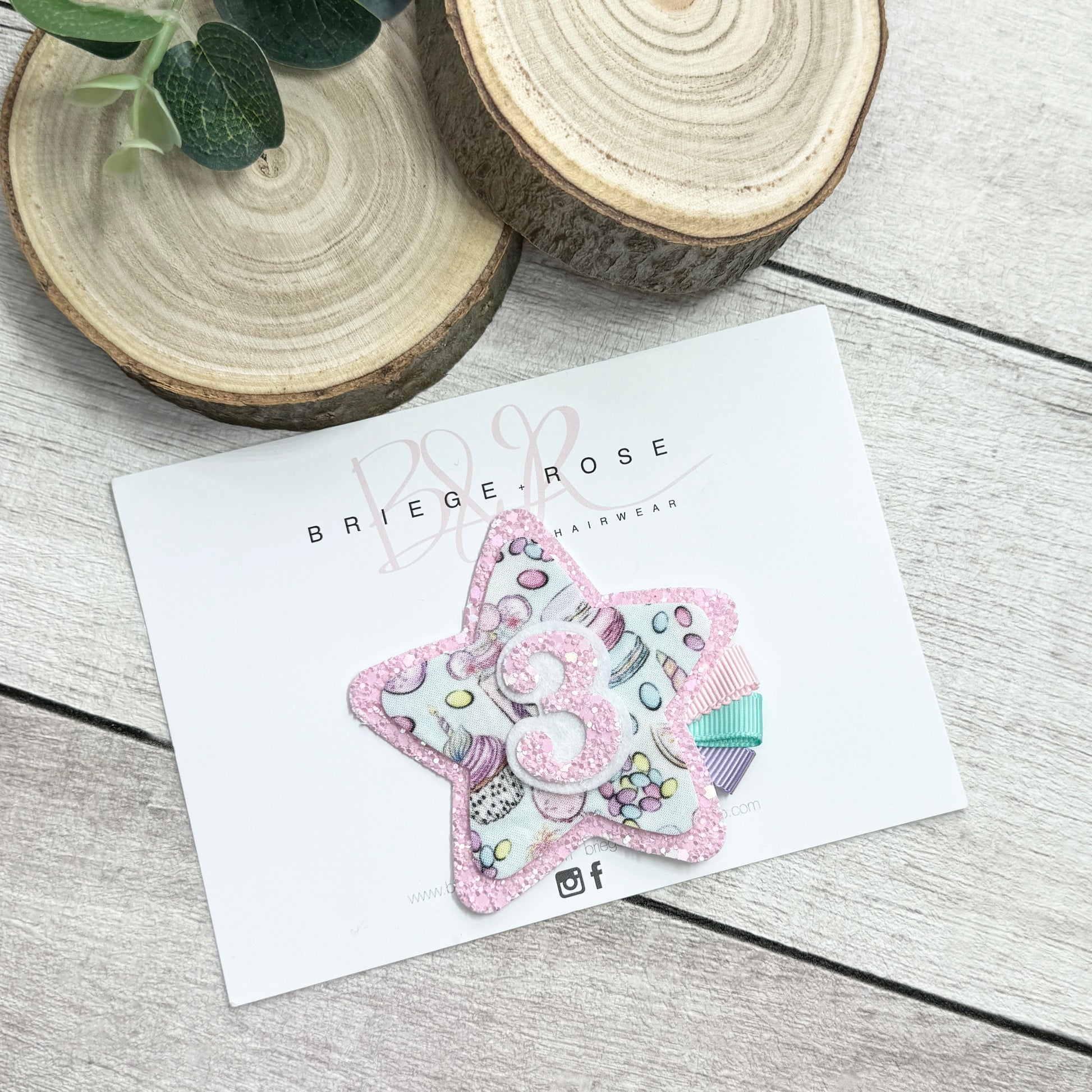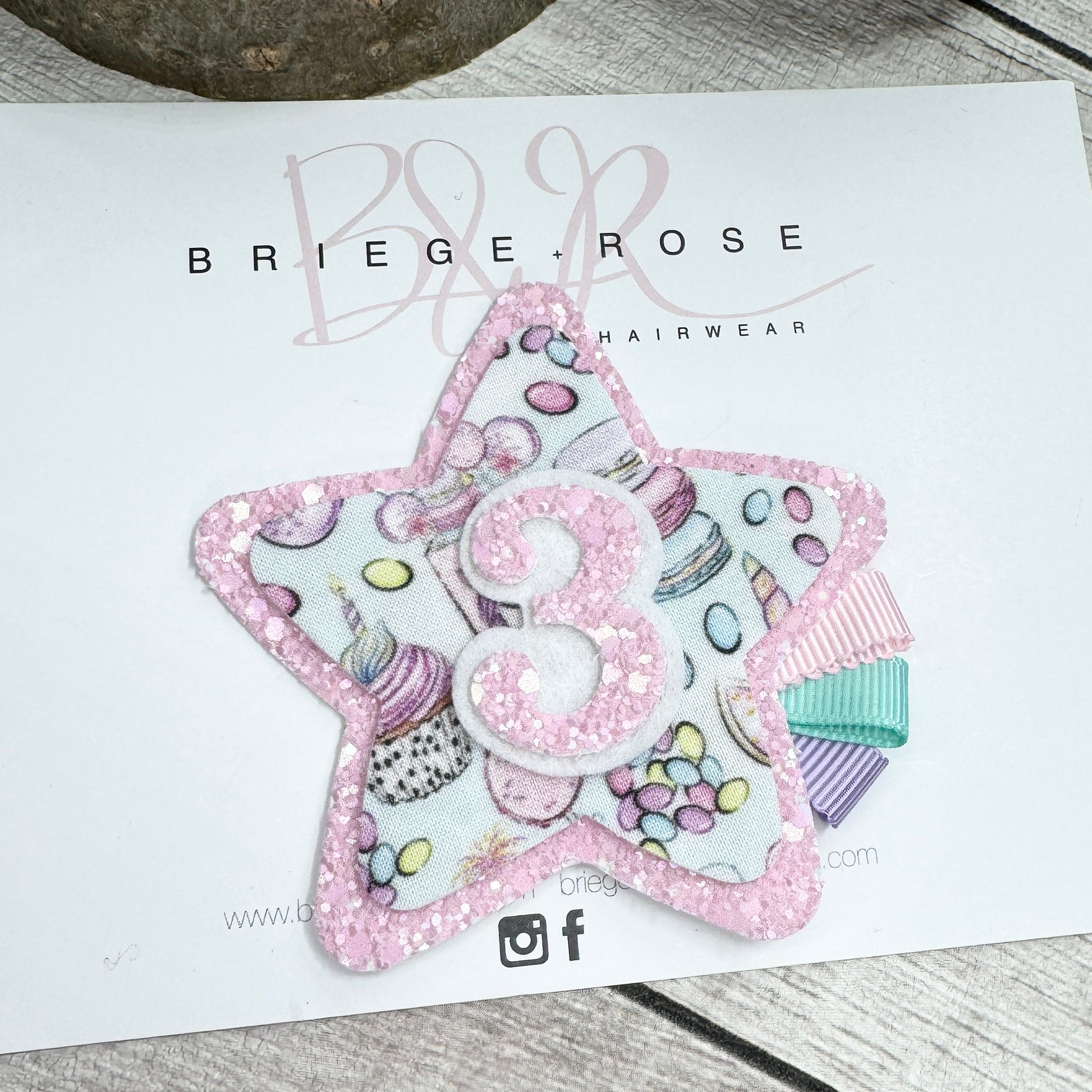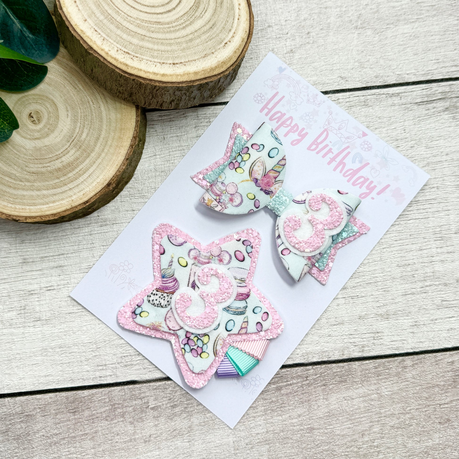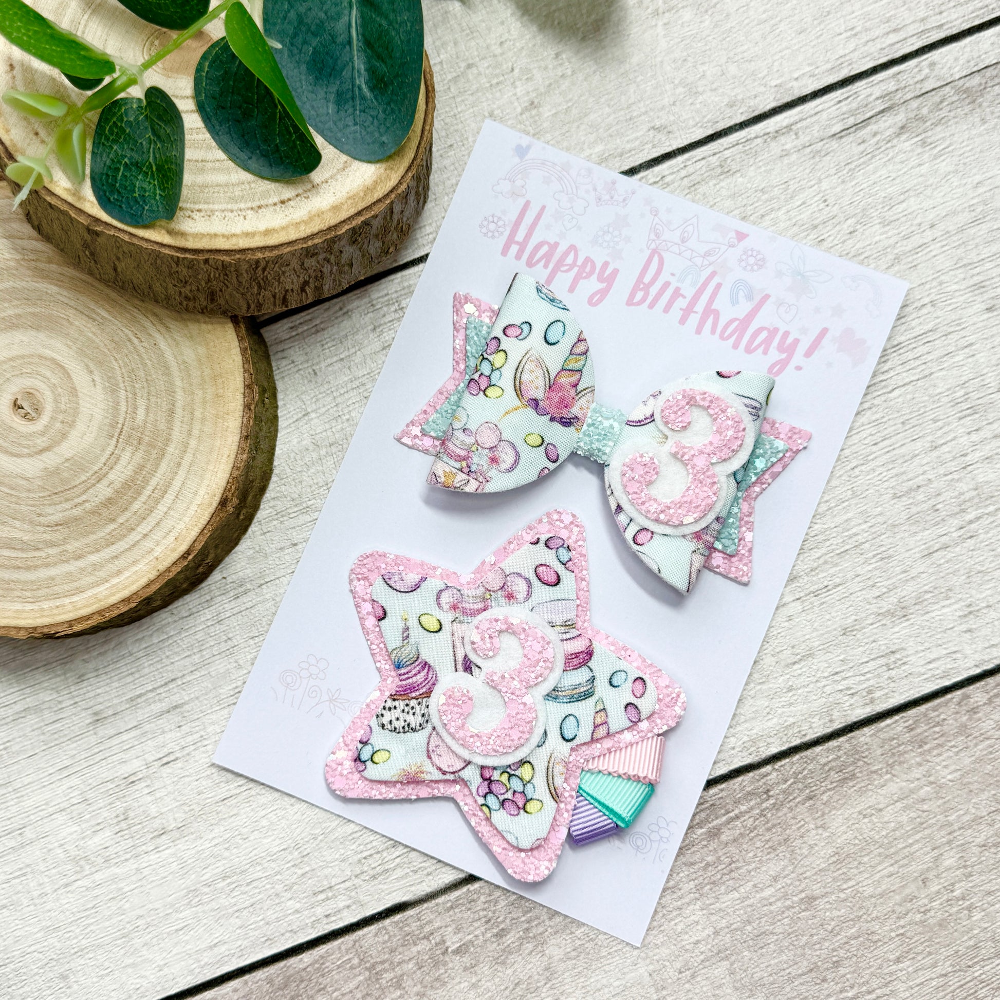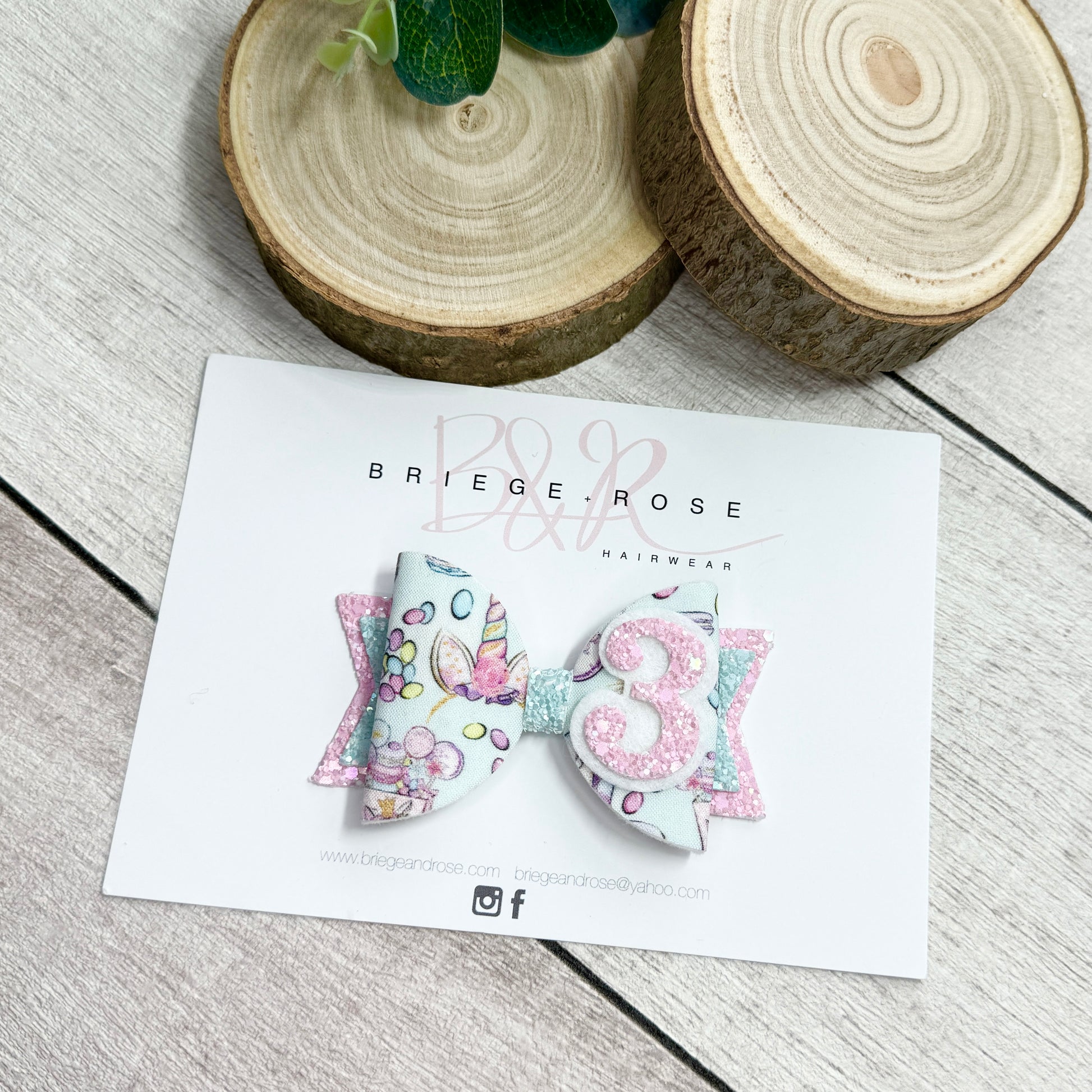 A gorgeous set of hair bow and matching badge in unicorn party print fabric with coordinating glitters and a number of your choice
